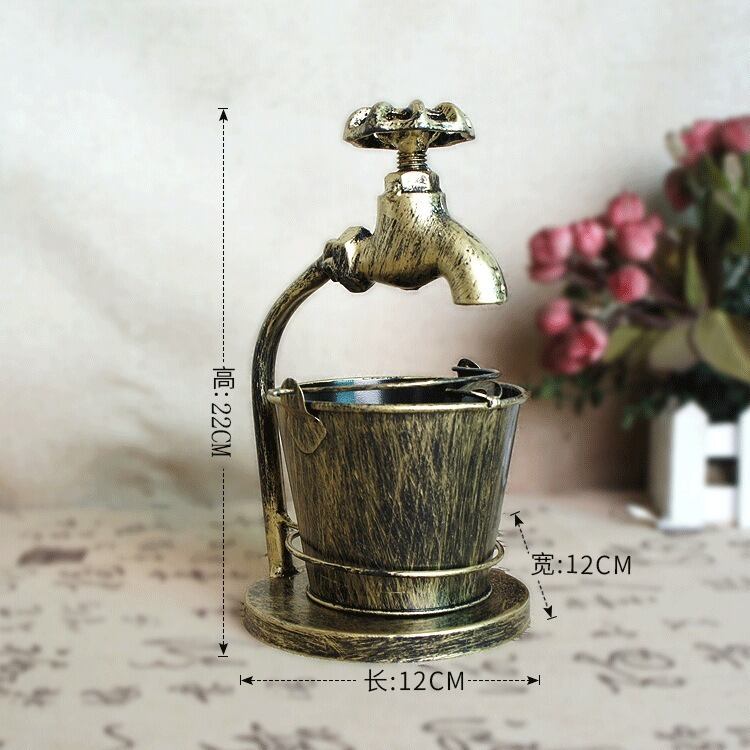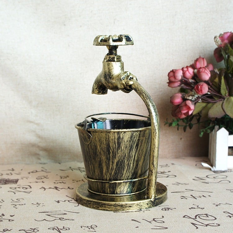 スタイリッシュなヴィンテージが魅力の蛇口型バケツと灰皿のデザイン。どちらもレトロな雰囲気が漂うアンティーク調で、インテリアを一層引き立てるアイテムです。ゴールドの輝きがアクセントとなり、モダンでありながらクラシックな魅力を感じさせます。