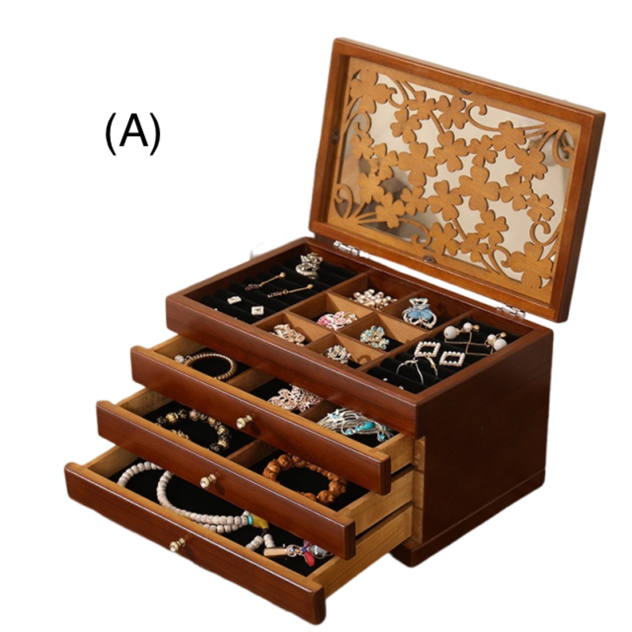 3段の引き出し収納が付いており、ネックレス、リング、イヤリング、ブレスレットなど、様々なアクセサリーをすっきり整理できます。上部には鏡が付いており、身支度を整えるにも際立って便利です。細部までこだわった作りで、大切なジュエリーを大切に収納できるよう設計されています。
