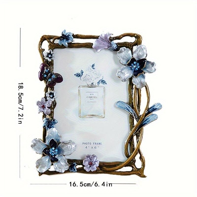 フラワーデザインが施された青い花のメタル製レトロなフォトフレームは、写真を飾るのに最適なアイテムです。