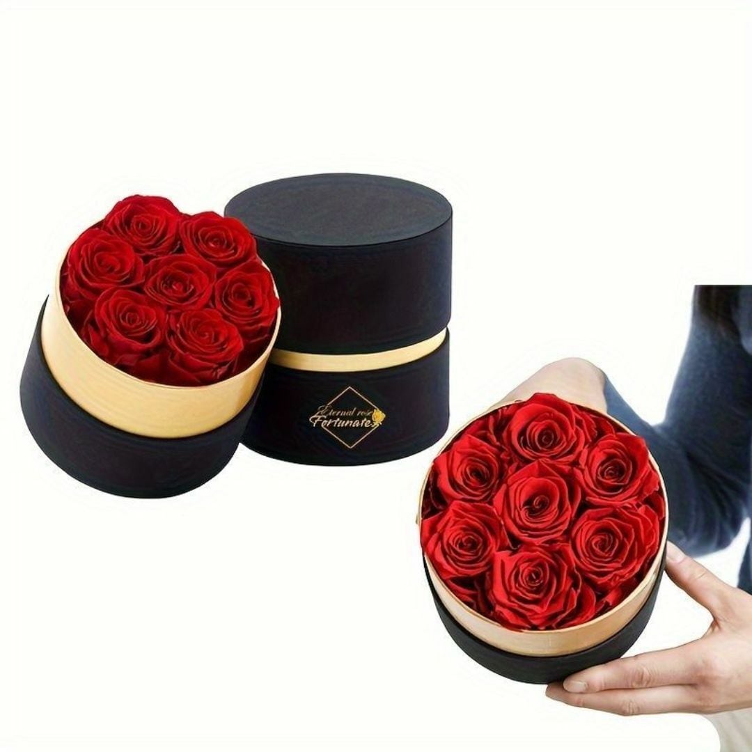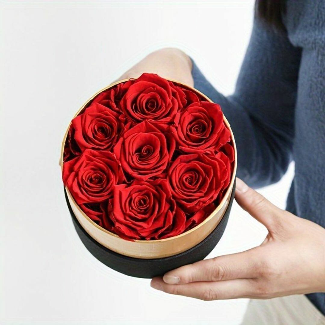バラのプリザーブドフラワーギフトは、ラウンドローズボックスに7個の花がセットされており、1年間その美しさを保ちます。