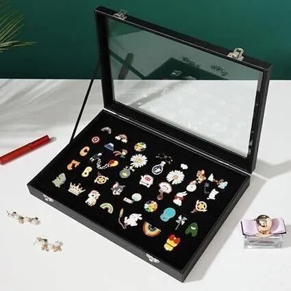こちらは、黒革を使用した高級感のあるジュエリーボックスで、大容量かつシックなダークトーンが特徴です。1枠と6枠の2種類から選べるため、用途やコレクションに合わせた収納が可能です。リングやブレスレットなど、さまざまなジュエリーを整理しながらディスプレイでき、透明なフタ付きなので中身を簡単に確認できます。