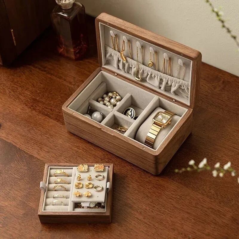 ジュエリーボックス 収納ボックス 宝石箱 木製 ハンドジュエリーポータブル ブラックウォールナット イヤリング ネックレス収納 2層式 指輪 イヤリング ネックレス 腕時計 大容量 ユニセックス プレゼント | Renatus インテリア 家具専門店