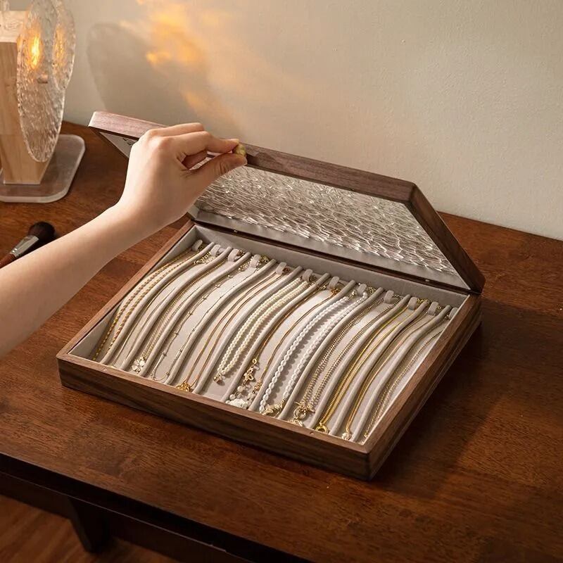 このネックレス収納ボックスは、ブラックウォールナットを使用したおしゃれな木製デザインで、パールペンダントや他のアクセサリーを特別に保管できるジュエリーボックスです。ガラス製のディスプレイボックスとしても機能し、美しいジュエリーを引き立てます。ユニセックスデザインなので、男女問わず使用でき、母の日のギフトや特別な贈り物としても最適です。高級感のある仕上げと実用性を兼ね備えたこのジュエリーボックスは、大切なネックレスを安全に収納し、いつでも見せることができるアイテムです。