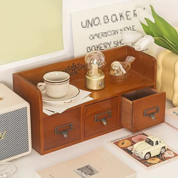 グリッドごとに分かれたスペースは、小物をすっきりと収納でき、上の棚にはお気に入りのアイテムなどを見せて収納することができます。
