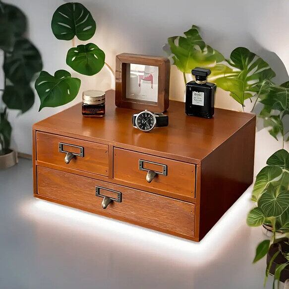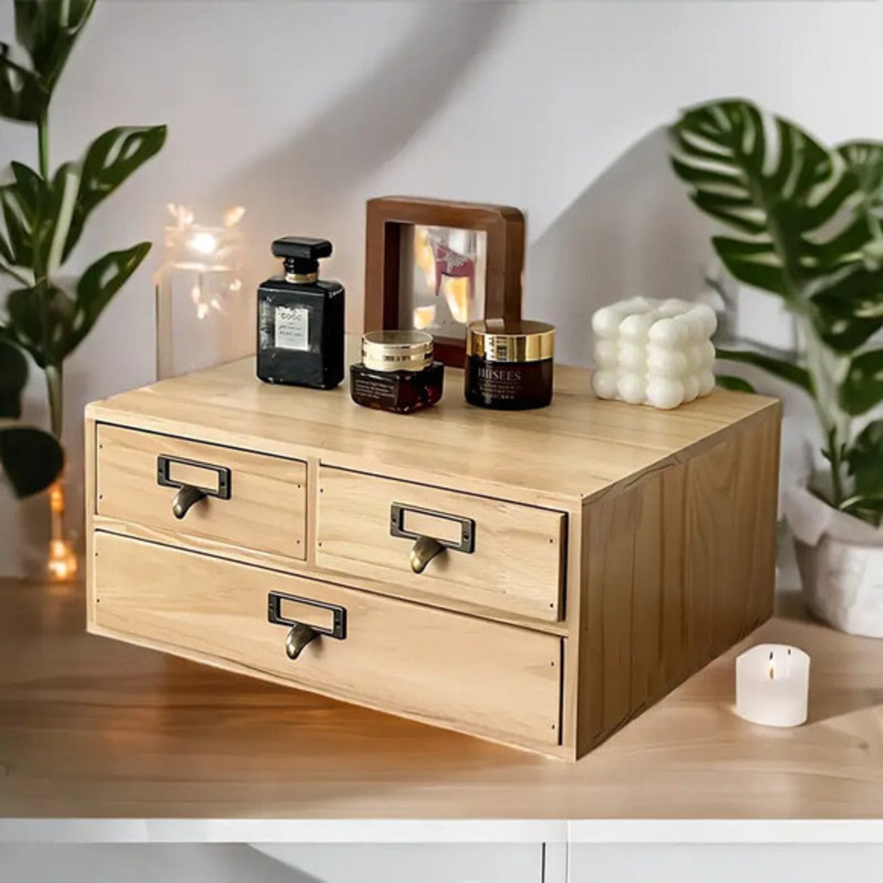グリッドごとに分かれたスペースは、小物をすっきりと収納でき、上の棚にはお気に入りのアイテムなどを見せて収納することができます。