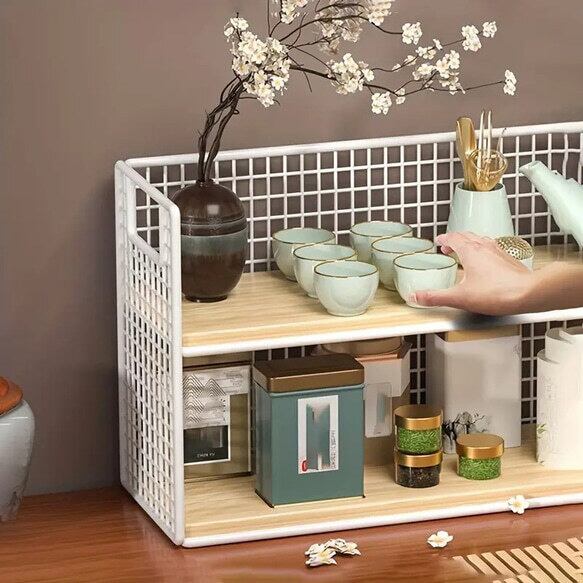 この小物収納棚は、実用性と美しさを兼ね備えており、リビングやキッチン周りの収納に最適です。