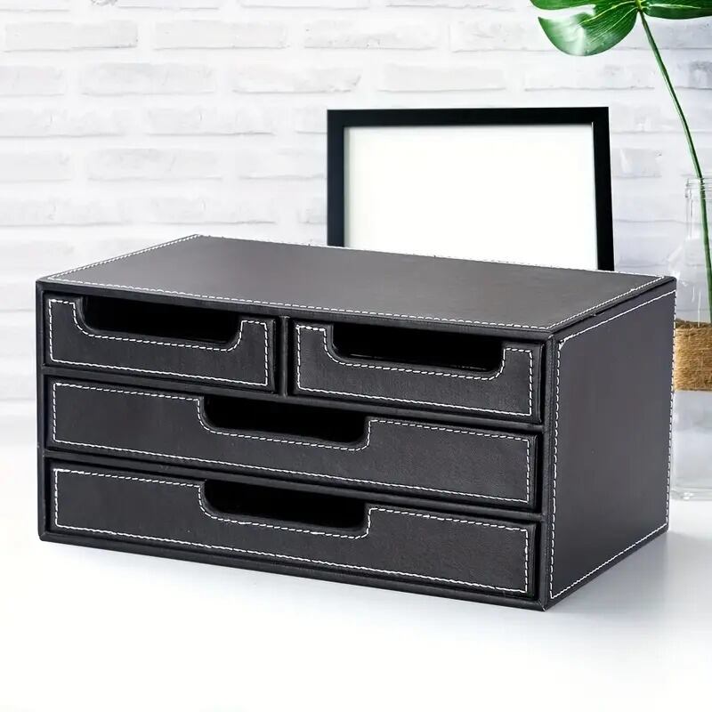 のブラックのフェイクレザー製収納ケースは、デスク周りを整頓するためのスタイリッシュで実用的なアイテムです。 文房具収納として、ペンやメモ帳、クリップなどの小物を整理できるほか、メイクボックスやレターケースとしても引き出し付きで、書類や事務用品をよく整理し、デスクをすっきりと眺めます。 フェイクレザーの質感が高級感を与え、シンプルでありながらモダンなデザインがどんなオフィスやワークスペースにも機能的でありながら、インテリアにも見やすい収納ケースです