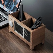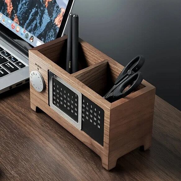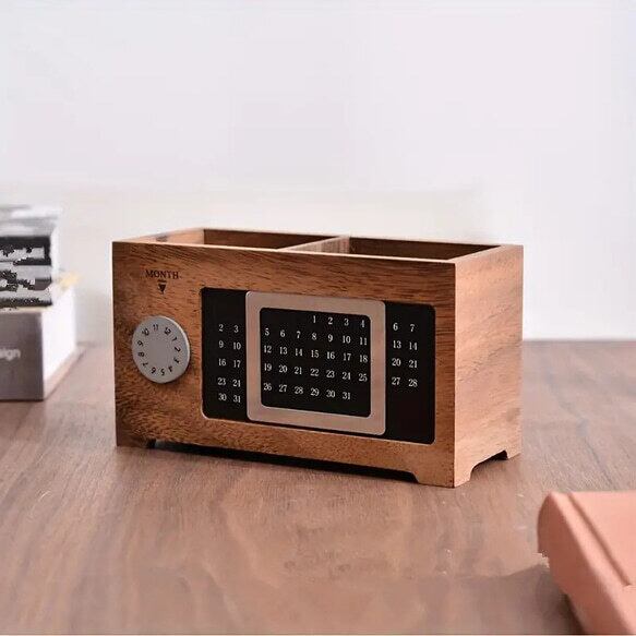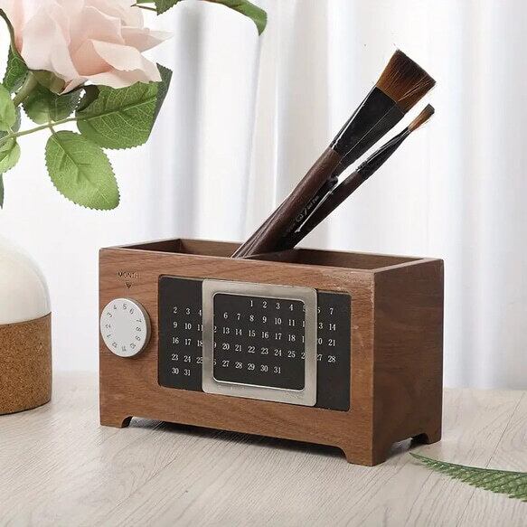 この木製の小物収納棚は、カレンダーが付いている多機能なペンホルダーです。