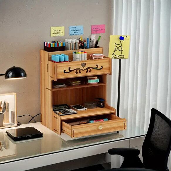 デスクの上にぴったりと収まるこの棚は、シンプルでありながらも機能的なデザインが魅力です。